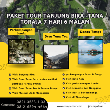 Jika Anda mencari liburan yang menyajikan pengalaman budaya yang kaya dan alam yang memukau, Paket Tour Tanjung Bira Tana Toraja 7 Hari 6 Malam adalah pilihan yang tepat. Dalam paket ini, Anda akan menjelajahi pantai eksotis Tanjung Bira, menyaksikan pembuatan perahu pinisi yang legendaris, serta mengunjungi situs budaya yang unik di Tana Toraja. Bergabunglah dengan tim Campa Tour dan nikmati perjalanan yang tak terlupakan!