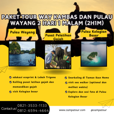 Perpaduan wisata alam liar dan keindahan laut Lampung menjadi daya tarik utama dalam Paket Tour Way Kambas dan Pulau Wayang 2 Hari 1 Malam (2H1M). Dalam dua hari perjalanan, wisatawan akan merasakan sensasi menyatu dengan alam melalui interaksi langsung dengan gajah di Way Kambas serta menikmati kejernihan laut di Pulau Wayang dan sekitarnya. Paket ini cocok untuk kamu yang ingin menikmati dua sisi keindahan Lampung — darat dan laut — dalam satu perjalanan singkat penuh pengalaman seru.