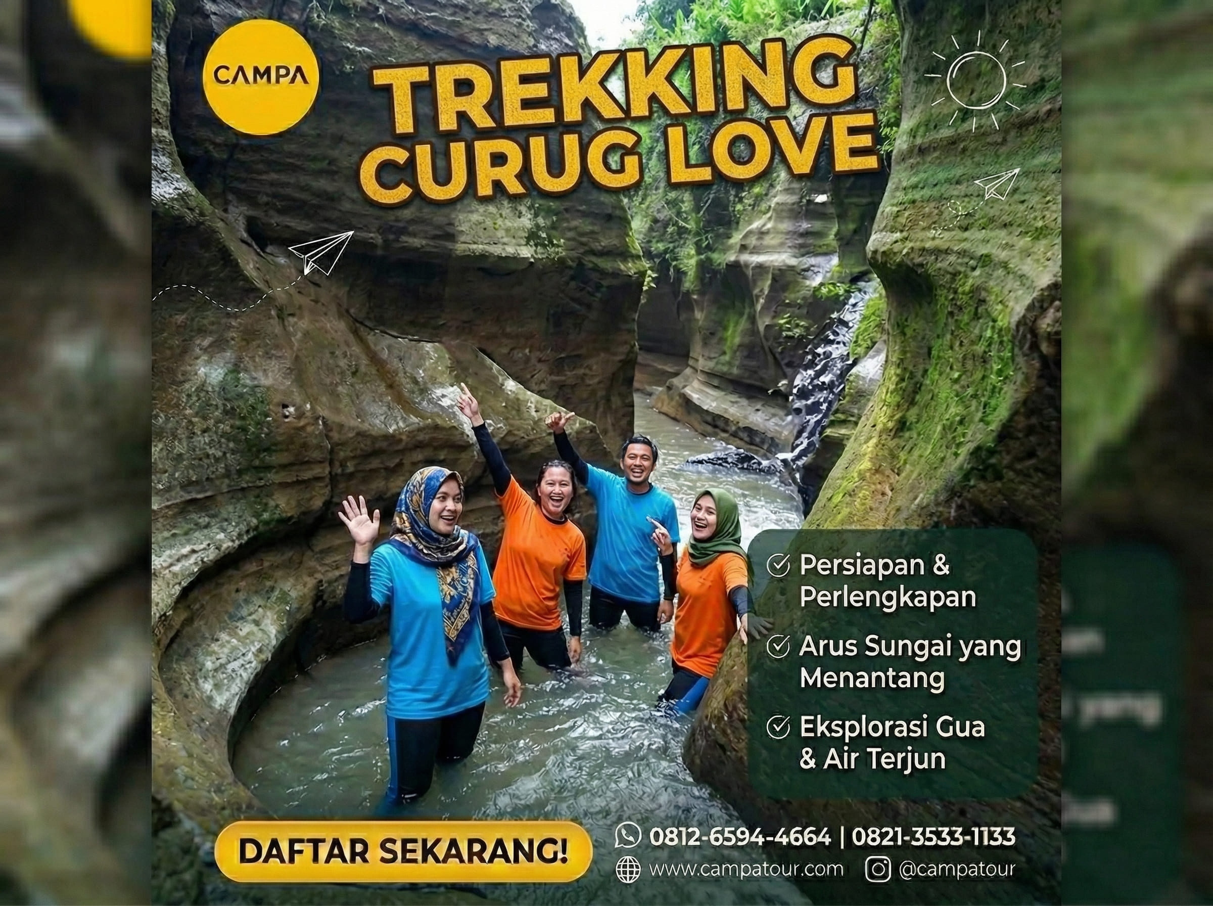 Bagaimana? Selain itu, jika kamu tertarik untuk merasakan sendiri pengalaman seru trekking di Curug Love Nanggung, segera daftar untuk mengikuti paket tour wisata ini bersama Campa Tour. Dengan jasa pemandu wisata profesional yang berpengalaman, kamu tidak perlu khawatir mengenai rute perjalanan, persiapan, atau hal teknis lainnya. Kamu hanya perlu menikmati petualangan seru, keindahan alam, dan momen-momen tak terlupakan bersama teman, keluarga, atau pasangan. Liburan di Bogor akan menjadi pengalaman yang luar biasa, penuh dengan kenangan indah. Selain itu, jangan lewatkan kesempatan untuk menjelajahi keindahan alam yang tersembunyi di Bogor.