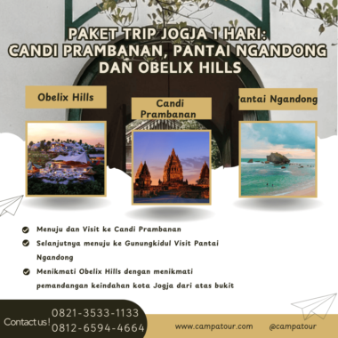 Paket Trip Jogja 1 Hari: Candi Prambanan, Pantai Ngandong dan Obelix Hills- Nikmati satu hari penuh petualangan di Jogja dengan perpaduan wisata budaya, pantai tropis, dan panorama kota dari ketinggian. Paket ini dirancang untuk Anda yang ingin mengeksplor sisi klasik dan modern Yogyakarta dalam waktu singkat namun berkesan.