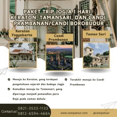 Paket Trip Jogja 1 Hari: Keraton, Tamansari, dan Candi Prambanan/Candi Borobudur- Pertama-tama, tim kami menjemput Anda di bandara atau stasiun Yogyakarta sesuai jadwal yang disepakati. Kemudian, perjalanan dimulai menuju jantung budaya Jawa; selanjutnya, Anda akan merasakan nuansa sejarah yang kental sepanjang hari.