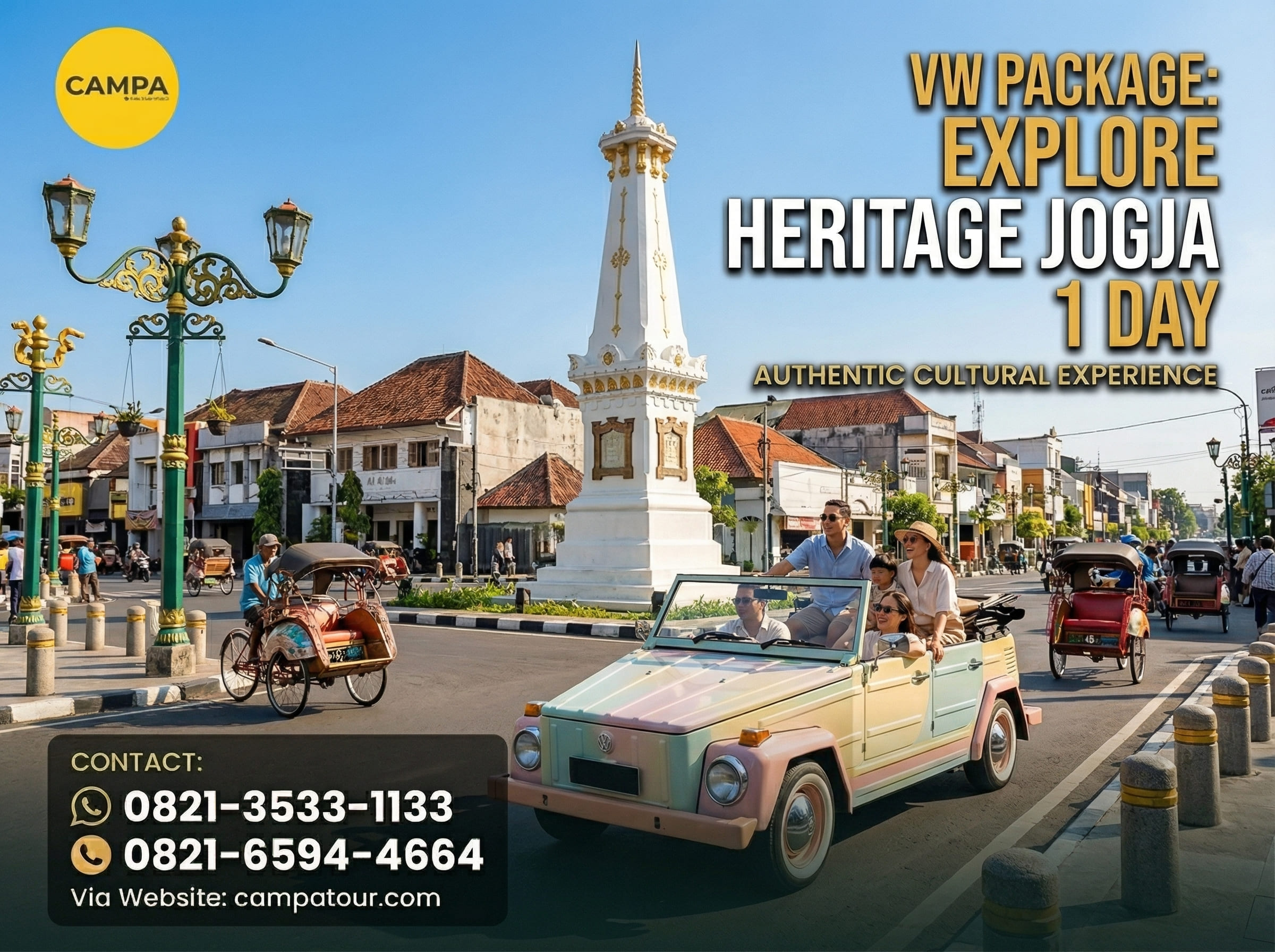 Paket VW Explore Heritage Jogja bersama tim Campatour untuk menikmati perjalanan tour menuju berbagai tempat wisata menarik di Jogja. Tim Campatour akan membawa para peserta menjelajahi beberapa tempat wisata di Jogja yang penuh dengan sejarah, budaya, dan keindahan alam. Liburan di Jogja bersama tim pemandu tour guide berpengalaman dari Campatour akan mendapatkan sebuah pengalaman liburan yang lebih mengesankan dan tak terlupakan.