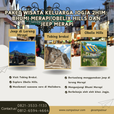 Jogja selalu punya cerita yang menarik untuk dijelajahi. Kota budaya ini bukan hanya terkenal karena keramahan penduduknya, tetapi juga karena beragam destinasi wisatanya yang memukau. Untuk keluarga yang ingin merasakan pengalaman liburan singkat namun penuh makna, paket wisata 2 hari 1 malam ini bisa menjadi pilihan tepat. Dalam waktu singkat, Anda dan keluarga akan menikmati keindahan alam, budaya, serta petualangan seru di kawasan Jogja, khususnya Bhumi Merapi, Obelix Hills, dan tour jeep Merapi yang legendaris.