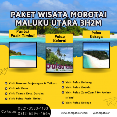 Paket Tour Morotai 3H2M dari Campa Tour adalah kesempatan sempurna untuk menjelajahi surga tersembunyi di Maluku Utara. Tim tour guide lokal yang berpengalaman siap membawa Anda dalam petualangan seru mengunjungi pantai-pantai eksotis dan situs-situs bersejarah, termasuk yang terkait dengan Perang Dunia II. Dengan durasi tiga hari dua malam, peserta akan merasakan pengalaman tak terlupakan di pulau yang kaya akan sejarah dan keindahan alam.