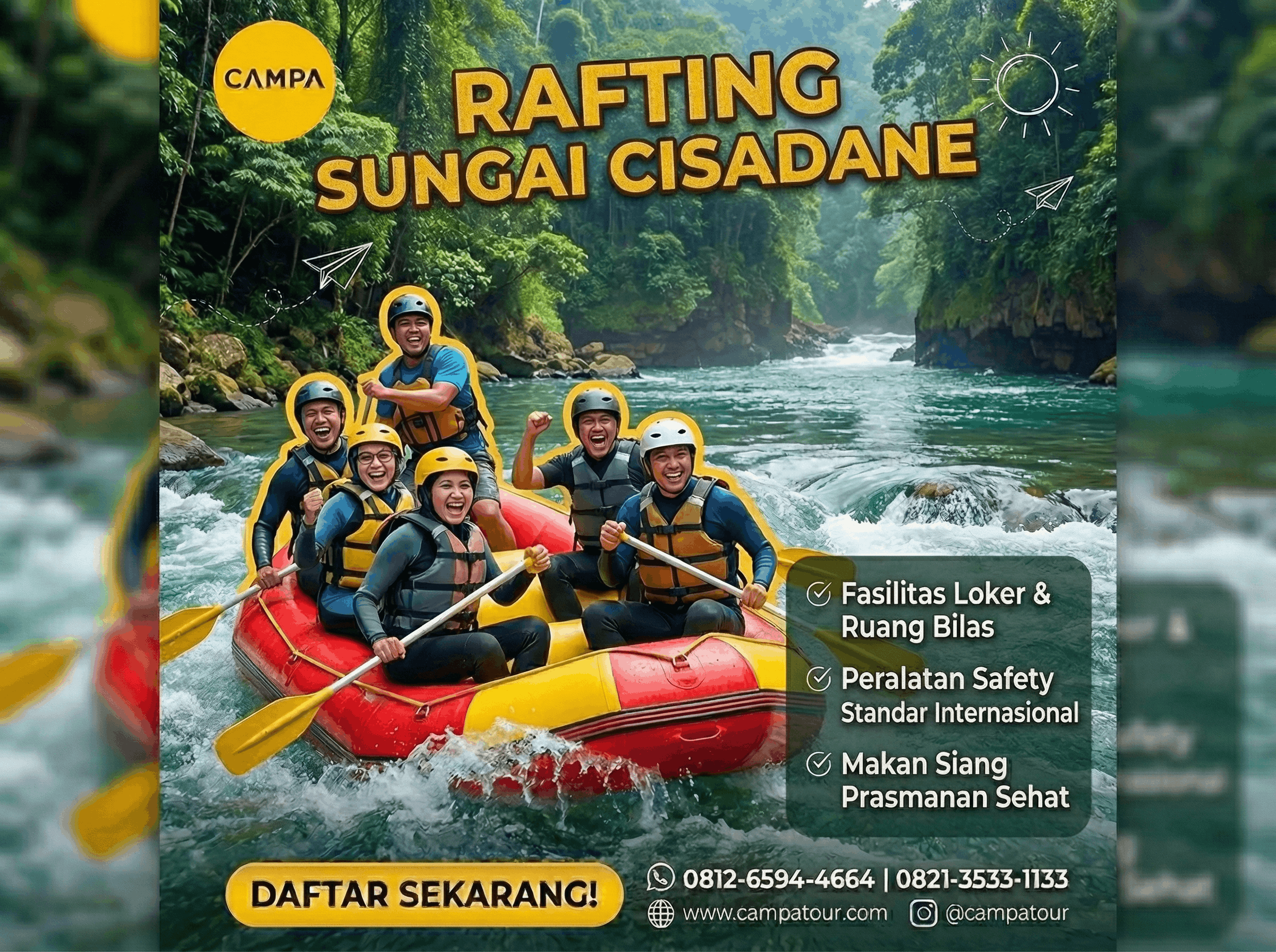 Bergabunglah bersama Campa Tour dan rasakan sensasi rafting di Sungai Cisadane yang seru dan penuh tantangan. Dengan pemandu yang berpengalaman dan fasilitas yang memadai, pengalaman rafting Anda dijamin akan menyenangkan dan aman. Segera daftarkan diri Anda untuk menikmati petualangan seru di Sungai Cisadane dan nikmati liburan tak terlupakan di Bogor!