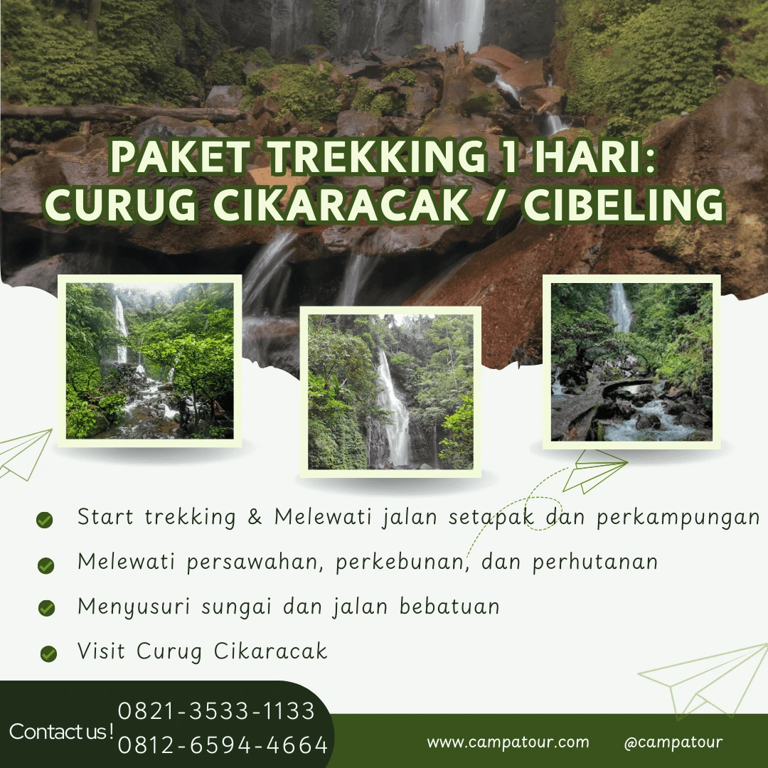 Trekking Curug Cikaracak dan Curug Cibeling adalah layanan wisata yang disediakan oleh tim Campa Tour untuk para pelancong yang ingin menjelajahi keindahan alam Bogor. Selain itu, kedua air terjun ini tidak hanya menawarkan pemandangan yang memukau, tetapi juga suasana yang tenang, menjadikannya destinasi sempurna untuk melarikan diri dari kesibukan sehari-hari. Selain itu, dengan mengikuti trip ini, kamu bisa menikmati petualangan seru sambil bertemu dengan teman-teman baru. Campa Tour menyediakan paket trekking yang dapat disesuaikan dengan preferensimu, memastikan pengalaman yang tak terlupakan.