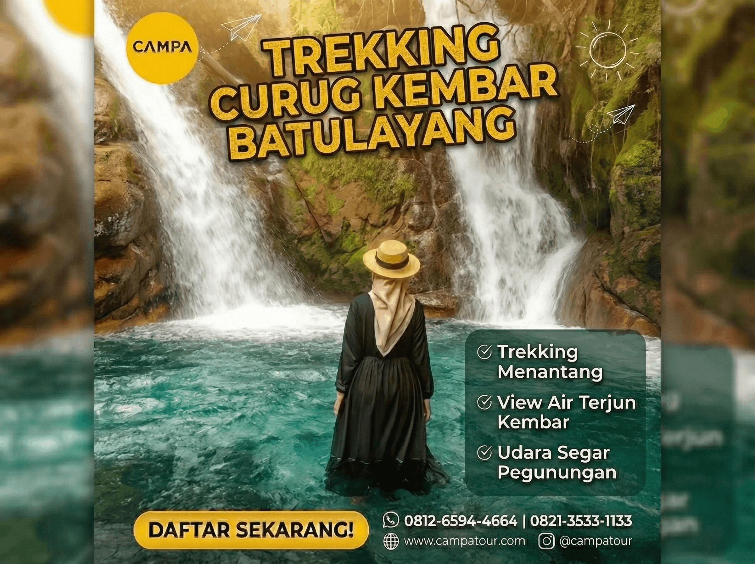 Tunggu apa lagi? Ayo, segera daftar trekking sekarang juga untuk menikmati petualangan trekking yang seru dan tak terlupakan ke Curug Kembar Batulayang bersama Campa Tour. Hubungi kami untuk informasi lebih lanjut mengenai daftar Paket Trekking Curug Kembar Batulayang di Campa Tour dan detail paket tour Bogor atau paket wisata Bogor lainnya. Jangan lewatkan kesempatan untuk menjelajahi keindahan tempat wisata alam Bogor, tempat wisata di Bogor, dan menjadikan liburan Anda di Bogor sebagai pengalaman yang tak terlupakan! Segera hubungi kami dan rencanakan jalan-jalan ke Bogor Anda sekarang juga! Kami juga menawarkan open trip Curug di Bogor yang menarik. Sebagai salah satu destinasi wisata Bogor, Curug Kembar Batulayang menunggu kunjungan Anda.