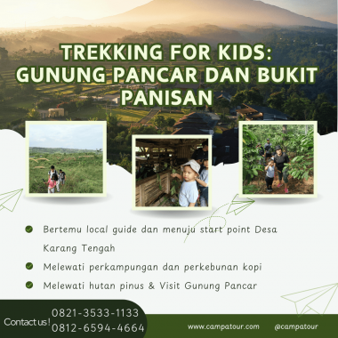 Paket wisata Trekking For Kids Rute Gunung Pancar dan Bukit Panisan adalah layanan tour guide oleh tim Campa Tour. Layanan ini cocok untuk para pecinta alam, petualang, atau bahkan untuk pendidikan anak usia dini seperti TK dan Paud. Program ini dirancang khusus untuk memberikan pengalaman wisata edukasi yang menyenangkan dan bermanfaat di alam terbuka. Apabila Anda mencari kegiatan liburan yang seru bersama keluarga atau anak-anak, maka trekking di Gunung Pancar dan Bukit Panisan adalah pilihan yang tepat. Selain itu, pengalaman ini akan memberikan kesempatan untuk menjelajahi alam Bogor yang masih alami dan indah.