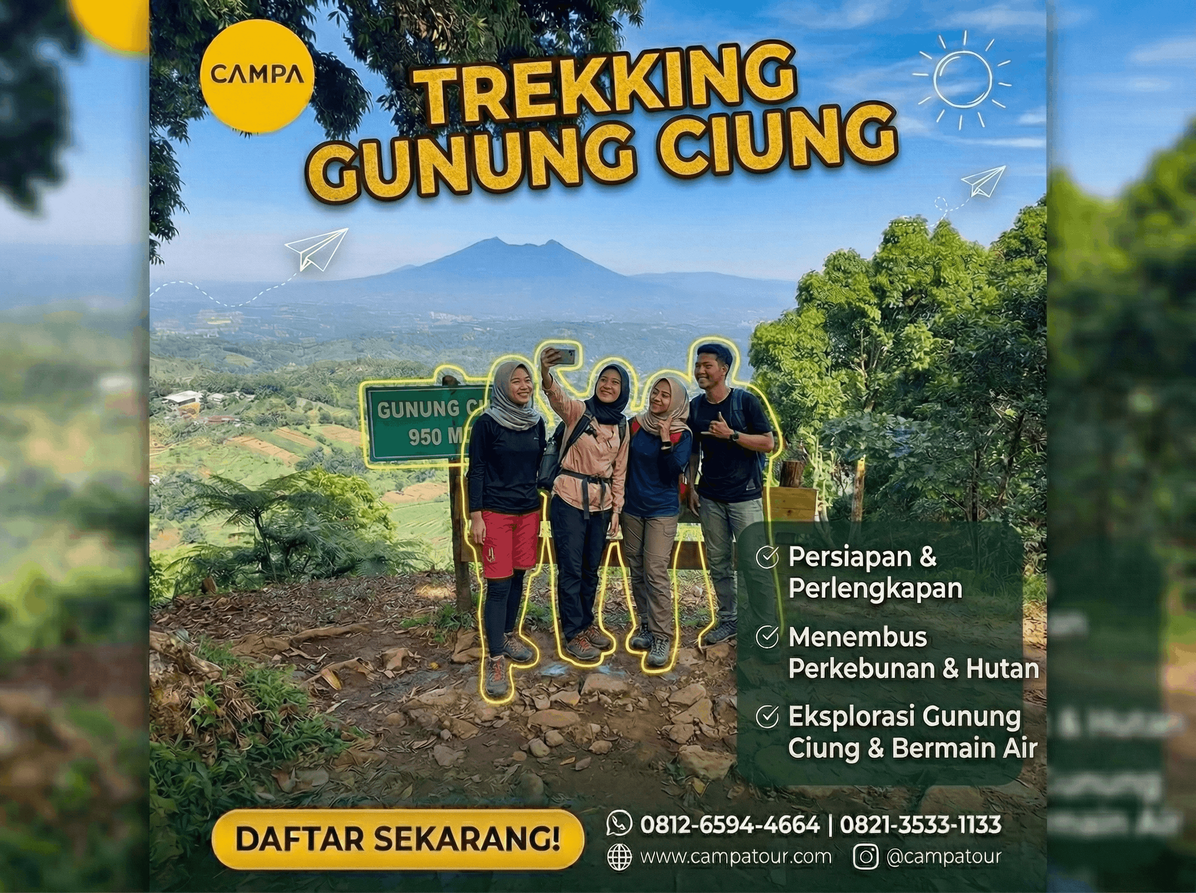 Jika Anda sedang mencari aktivitas alam yang menyehatkan, menyenangkan, dan mudah dijangkau dari Jakarta atau Bogor, Trekking Gunung Ciung adalah pilihan yang sangat ideal. Campa Tour siap mendampingi perjalanan Anda dengan layanan terbaik, guide berpengalaman, serta manajemen rute yang aman.