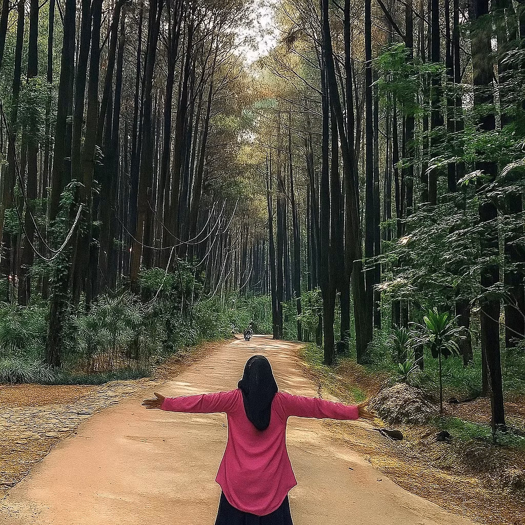 Setelah sampai di titik awal, trekking pun dimulai. Rute ini akan membawa Anda melewati hutan pinus yang rimbun, menyusuri jalur alami yang bersih dan sejuk. Selain menikmati pemandangan hijau di kiri dan kanan jalur, Anda juga akan melihat aktivitas warga di perkebunan yang berada di sekitar jalur trekking. Momen-momen seperti ini memberikan pengalaman yang tidak hanya menyenangkan, tetapi juga membumi.