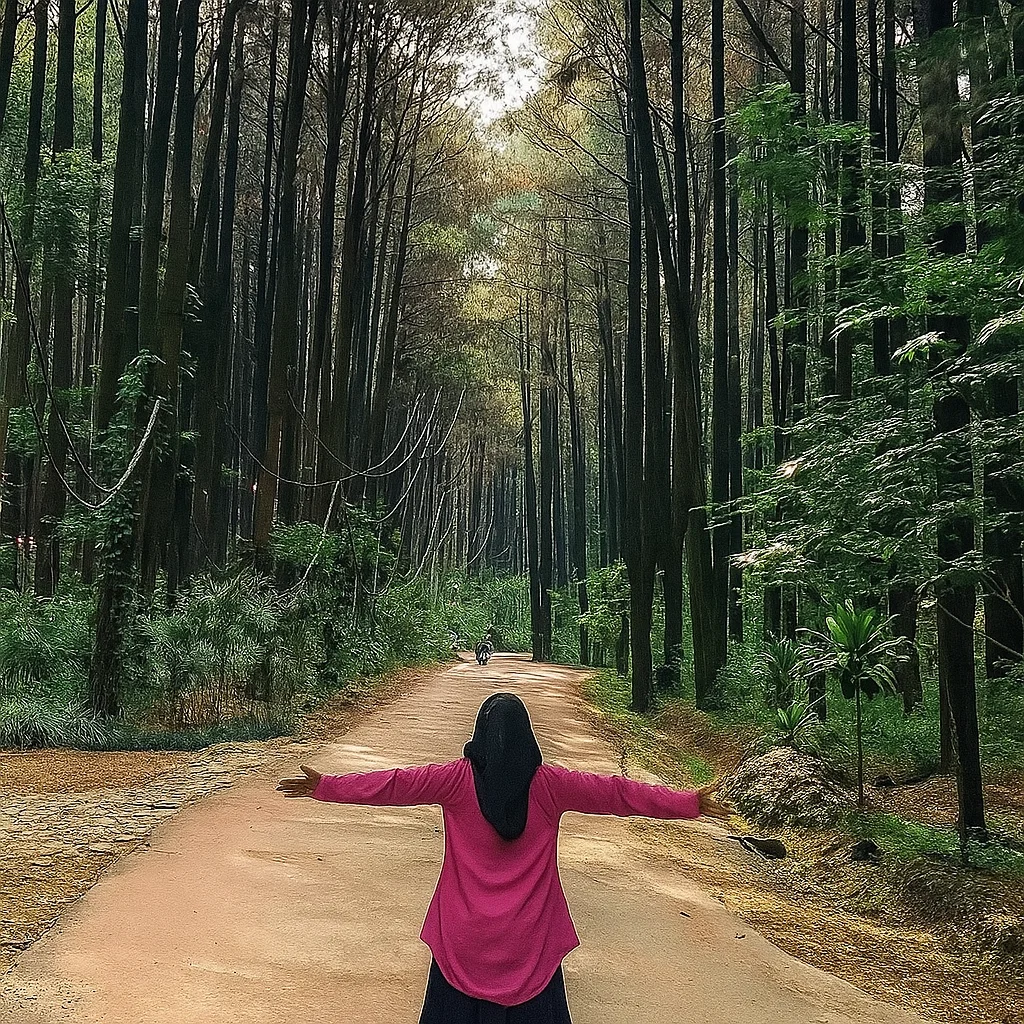 Setelah sampai di titik awal, trekking pun dimulai. Rute ini akan membawa Anda melewati hutan pinus yang rimbun, menyusuri jalur alami yang bersih dan sejuk. Selain menikmati pemandangan hijau di kiri dan kanan jalur, Anda juga akan melihat aktivitas warga di perkebunan yang berada di sekitar jalur trekking. Momen-momen seperti ini memberikan pengalaman yang tidak hanya menyenangkan, tetapi juga membumi.