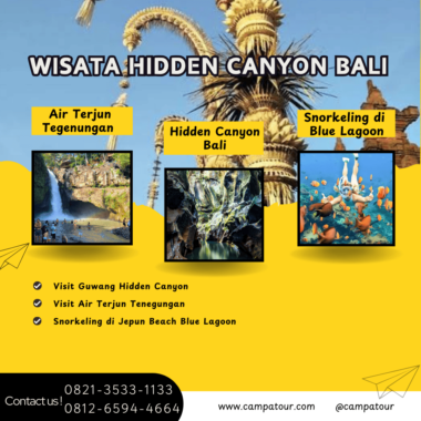 Wisata Hidden Canyon Bali adalah layanan jasa tour guide oleh tim Campatour bagi para pelancong yang ingin menikmati petualangan seru menjelajahi keindahan alam surga tersembunyi di pulau Dewata. Selain itu, Bali dikenal dengan keindahan pantainya, budaya yang kaya, dan keramahan penduduknya, menjadikannya sebagai destinasi wisata impian bagi banyak orang. Kata selanjutnya, bagi kamu yang sedang merencanakan liburan di Bali atau ingin merasakan pengalaman jalan-jalan yang menyenangkan, kamu bisa bergabung bersama tim Campatour dan memilih Paket Wisata Hidden Canyon Bali. Dengan paket ini, peserta akan menikmati petualangan seru menjelajahi tiga permata tersembunyi Bali, yaitu Guwang Hidden Canyon, Air Terjun Tegenungan, dan Jepun Beach Blue Lagoon, yang pastinya akan memberikan pengalaman lebih mengesankan dan tak terlupakan.